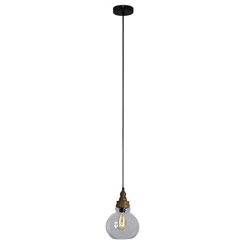 Bring rustic charm to your interiors with this elegant black and brown pendant light. Featuring a combination of steel and wood, complemented by a clear glass shade, this fixture adds warmth and sophistication to any room.