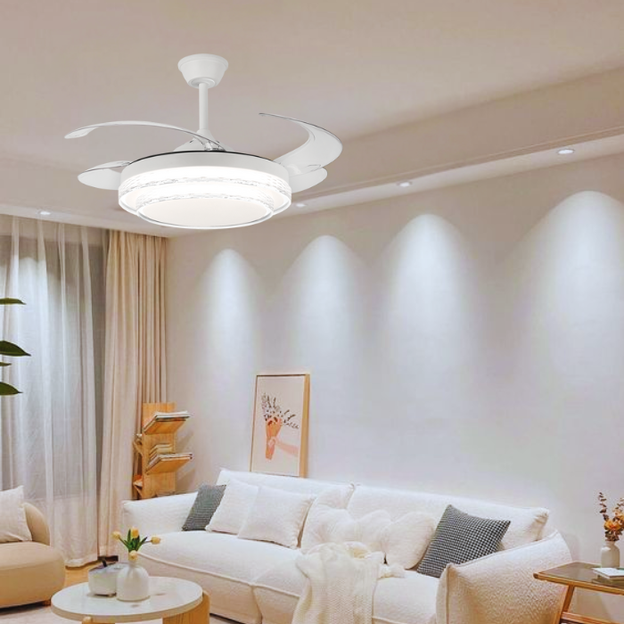 Elevate your indoor climate with the Bright Star FCF094 WHITE Ceiling Fan. This stylish ceiling fan features a sleek white design with clear ABS retractable blades, making it a perfect addition to any modern home. Crafted from durable metal with an acrylic and speckled PC cover, the FCF094 WHITE combines functionality and aesthetics. With its 30W copper coil DC motor and remote control featuring 6-speed settings, you can easily customize your comfort. The retractable blades extend and retract with a simple click, providing versatility and style, while the forward and reverse rotation options enhance airflow throughout the year.