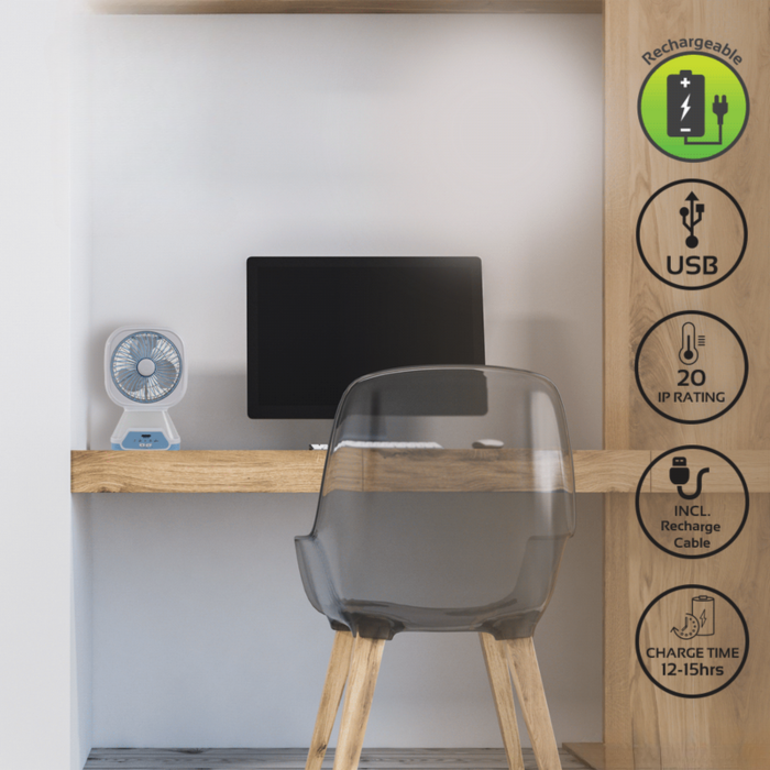 Elevate your comfort and convenience with the Eurolux F84 - Rechargeable Portable Mini Fan with LED Emergency Light & USB Input . This versatile device, also equipped with an LED Emergency Light and USB Input, is available in a stylish White & Blue finish, making it a perfect addition to your space.